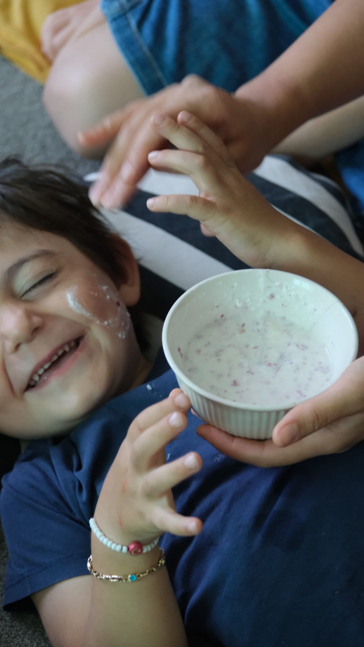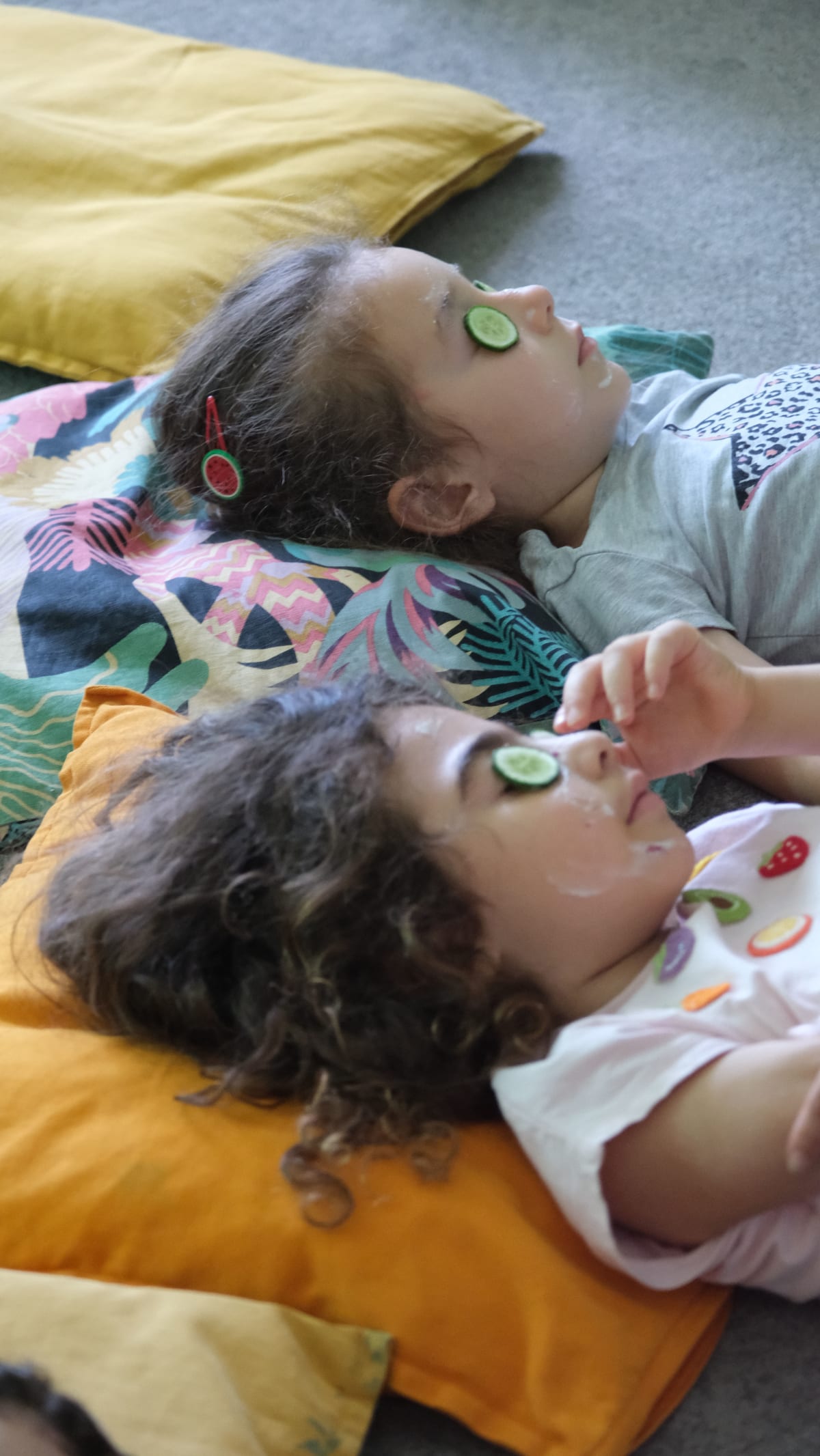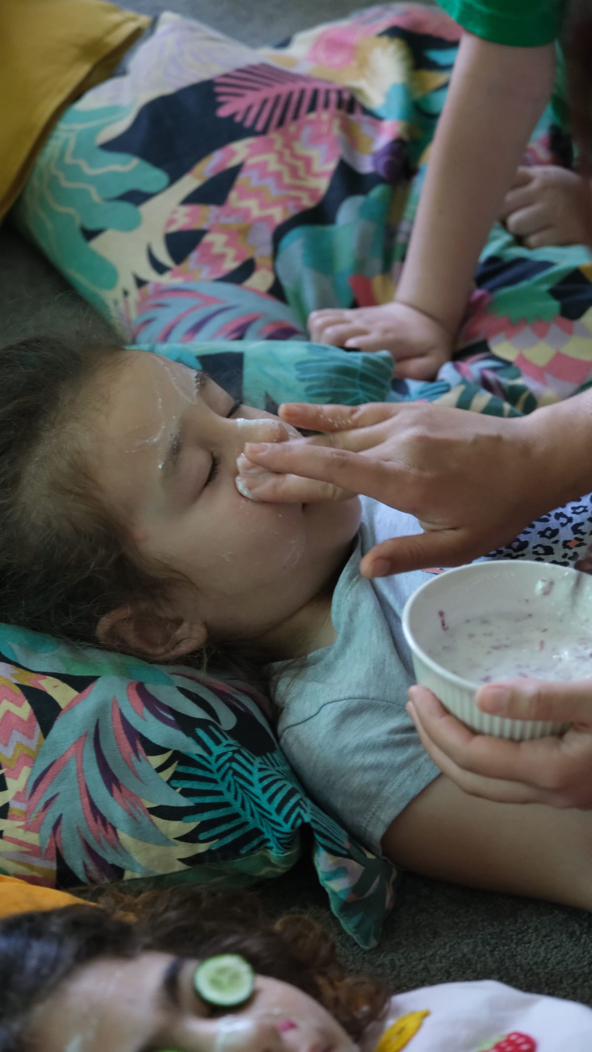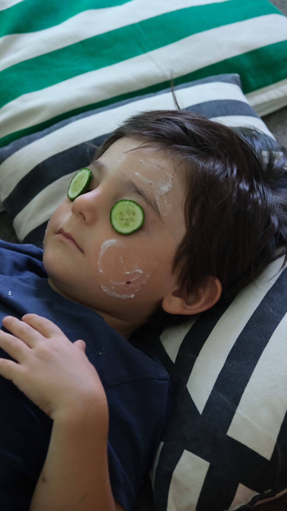 Günün sonunda sıra bakım zamanındaydı… Maske yaptık, salatalıklar gözlerimizde, arkadaşım bana yüz kremi sürdü. Sanki minik bir spa günü gibiydi! 💆♀️